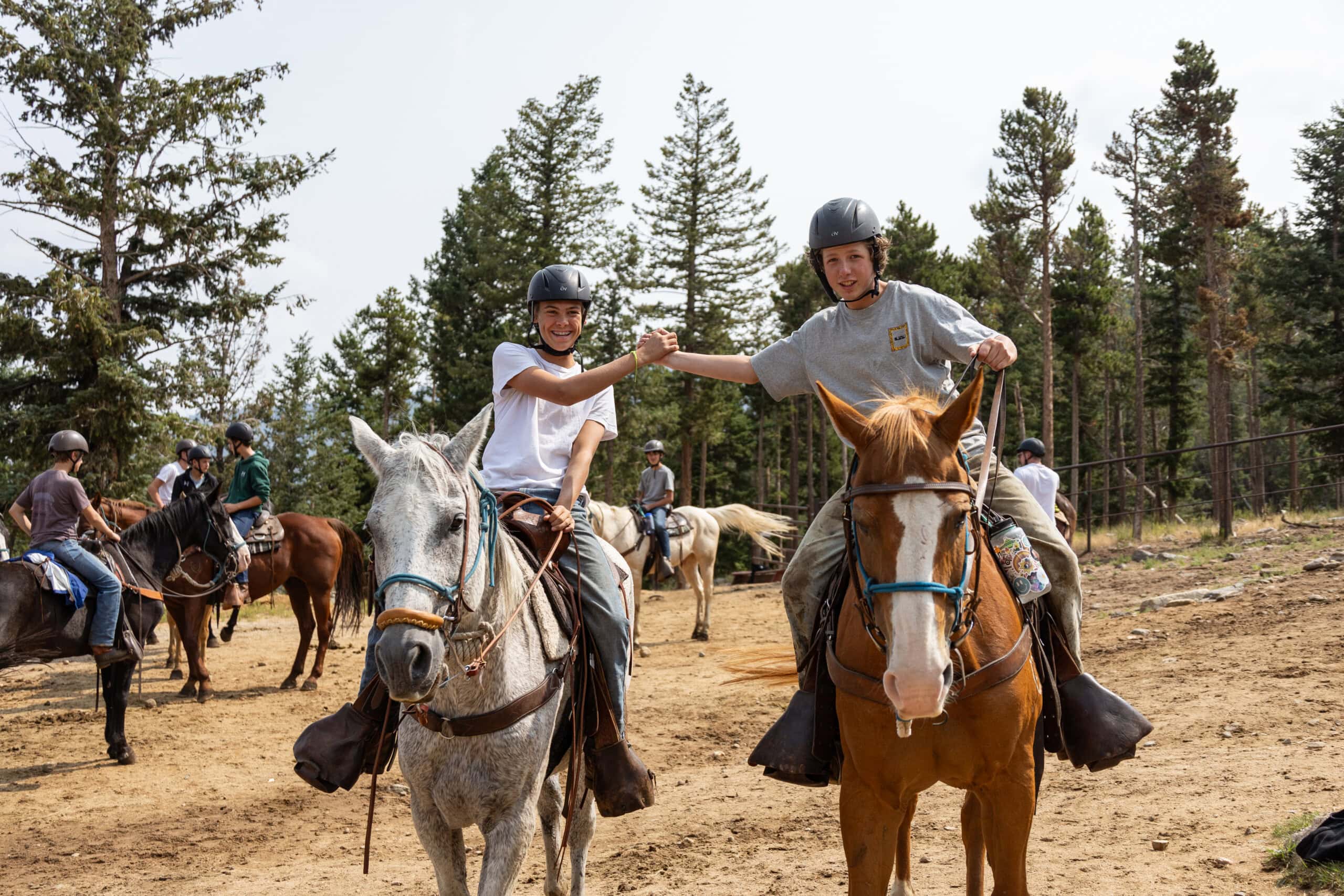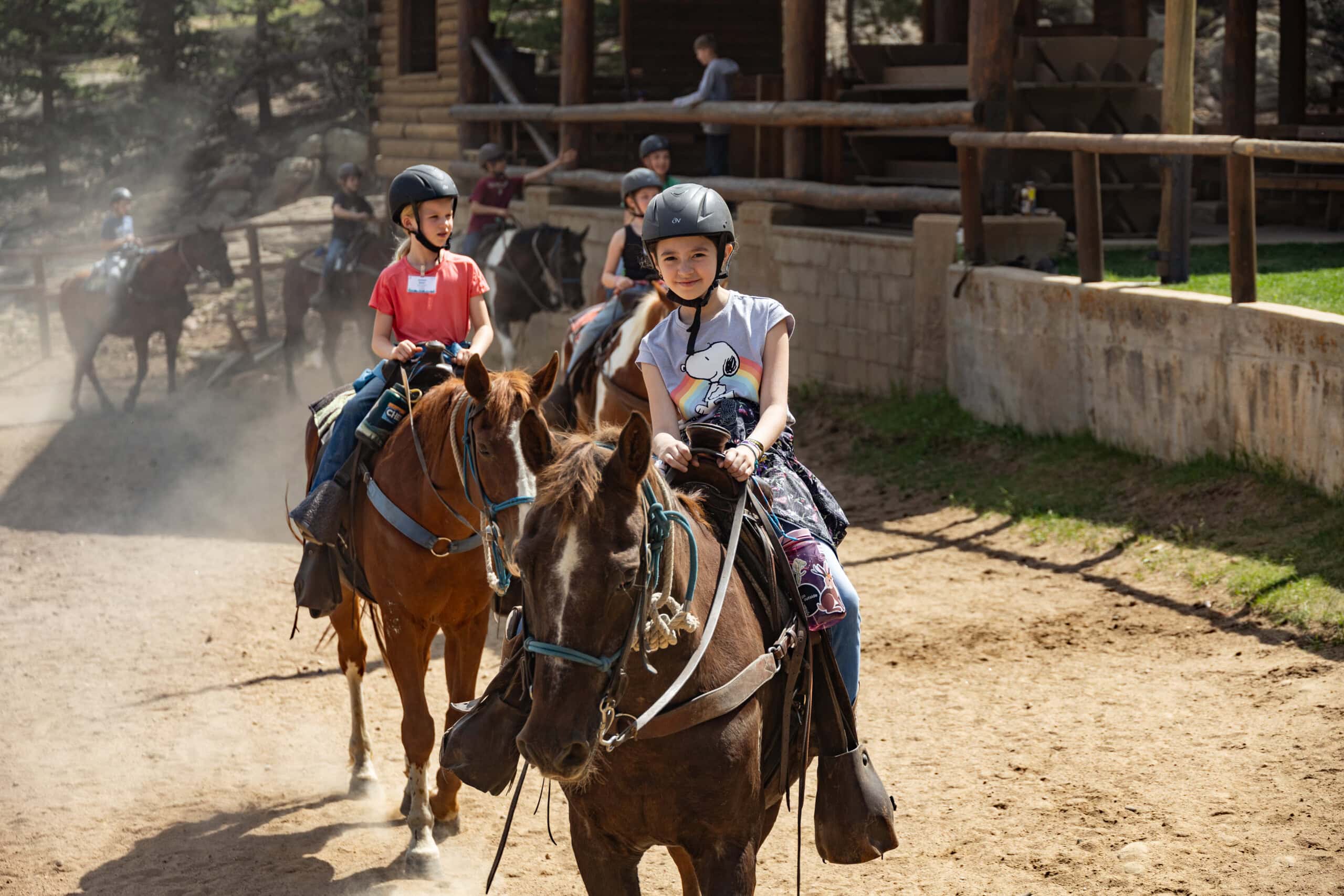 Imagine mounting a horse for the first time, then, hours later cantering around the riding ring on your favorite horse, completely connected with this 1,000-pound animal. During an instructional ring ride (one of many offerings in our horseback riding program), our excellent wranglers teach campers proper Western riding form, handling skills, and control as well as the essentials of grooming, tying knots, saddling, and bridling. In one of five riding rings, campers practice mounting and dismounting, walking, trotting and cantering, groundwork, and sometimes riding English. No ring ride is complete without barebacking, jumping, drill patterns, or a few games, whether it be Red Light, Green Light, Simon Says, or weaving through an Obstacle Course!