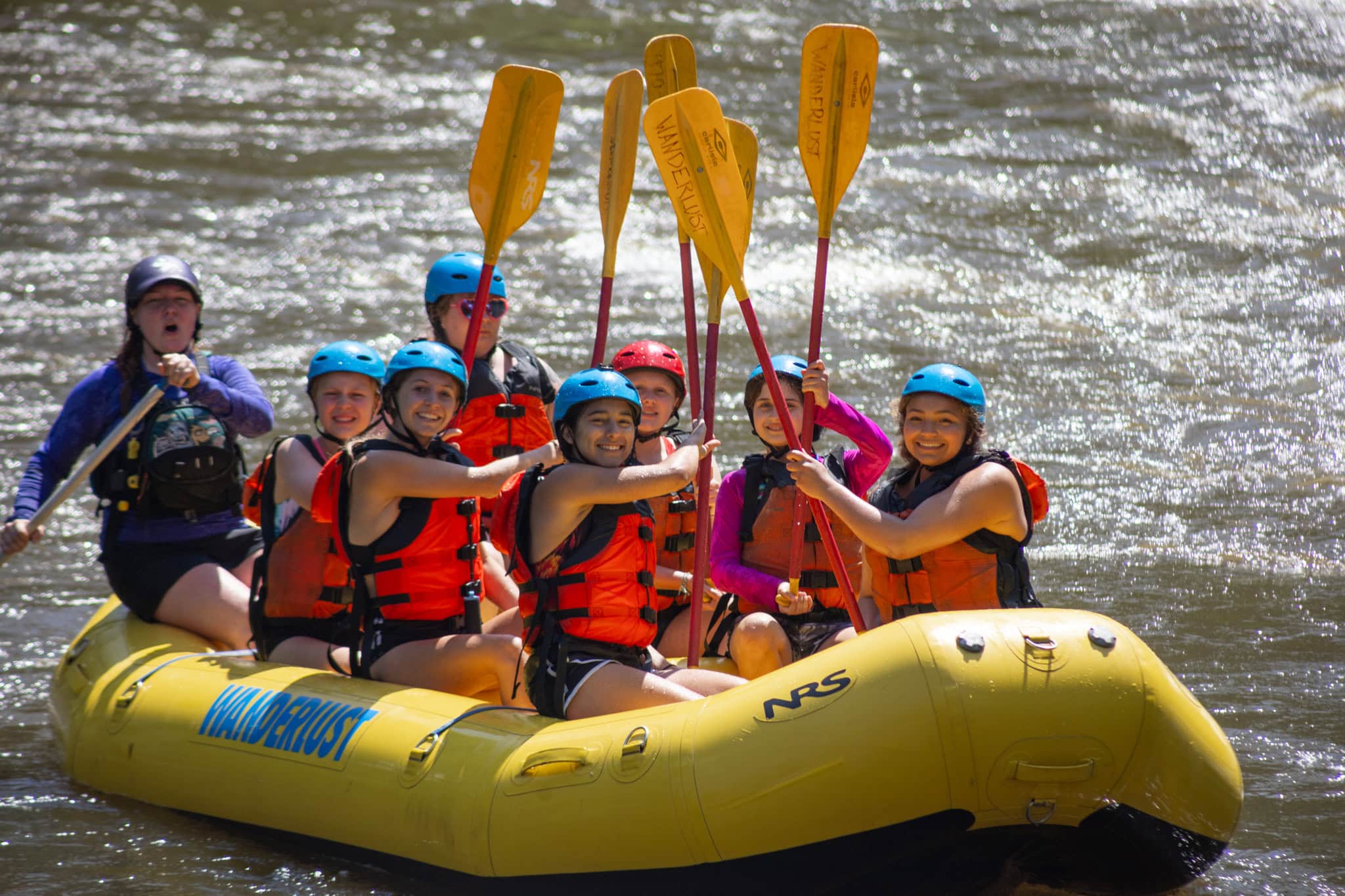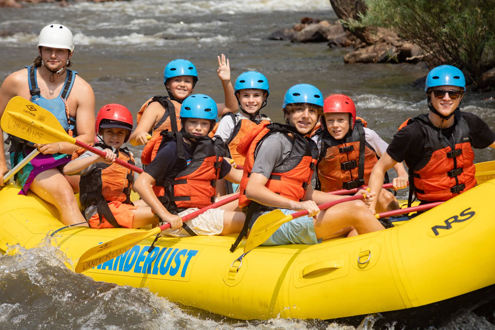On the unforgettable Poudre River, get ready for continuous Class II and III rapids, like Roller Coaster, Pinball, and Thunder Alley! Campers receive an orientation from a trained river guide via A Wanderlust Adventure (a Licensed River Outfitter) before heading downriver with them. Each raft of campers is also accompanied by a Cheley staff member. The scenery in the Poudre Canyon is exceptional and the almost continuous whitewater will provide excitement, thrills, and lifelong memories. On a hot summer day, the crystal-clear water is a welcome relief and campers love getting splashed while water fighting with other rafts. Wanderlust uses state-of-the-art NRS self-bailing rafts with foot cups, thwart handles, and grab lines.