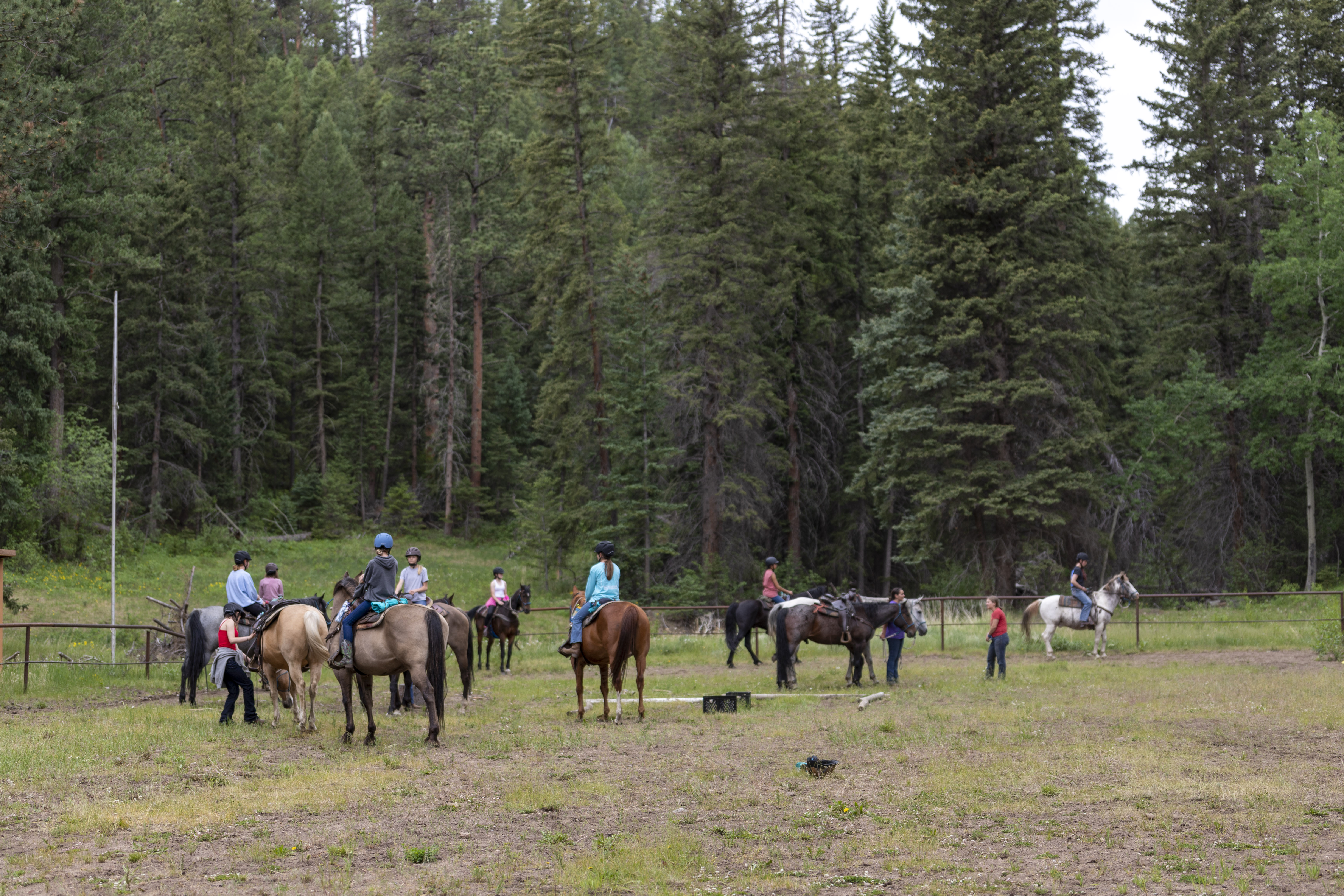 There was always some kind of adventure going on in our horseback riding program, whether it was mucking stalls, tacking horses for the day’s adventure, or packing for an overnight horse pack, there was always noise to be heard from the barns. This year’s riding program was led by wranglers Estie Seligman, Victoria Bostrom, Rachel Castro, and Frances Street! The girls took day trips to places like Bulwark Ridge, Piper’s Meadow, and Crosier Mountain, as well as overnight trips to True Gulch, Donner Pass, and the 3-day pack trip to Deserted Village. It was always fun to hear of their adventures when they came back from the barns. The following campers challenged themselves a bit more than just riding by learning emergency procedures, parts of the horse and tack, and various other things to complete their Jr Riding patch: Audrey Olson, Emma Schumacher, and Helen Rinehart. Earning their Sr. Riding patch this summer were Campbell Ardrey, Kira Bardin, Torlis Friedman TeBockhorst, and Karuna Kotak.
